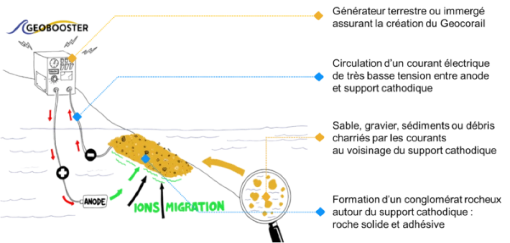 Au contact des sédiments et des débris coquillers avoisinant, une concrétion rocheuse se constitue sur la structure cathodique et vient s'agglomérer à ce dépôt calcomagnésien, créant ainsi le GEOCORAIL®, une roche naturelle, à l'aspect et aux propriétés proches du corail naturel.